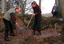 Vera Koppehel begrüßte die ca. 50 Gäste. Es schloß sich Herbert Schliffka an mit seinen Ausführungen über die Beziehung von Beuys zu Achberg. Rainer Rappmann sprach einige Worte über die Beuys-Methode des Weiblichen und ihren kolloidalen Charakter. Dann brach man auf ins Argenthal auf den Hasenweg zum eigentlichen Gründungsakt, dem etwa 25 Freunde und Freundinnen folgten. In der Nähe der Keltenschanze wurde gegraben, zunächst symbolisch mit einer Nachempfindung des "Doppelspatens" von Beuys und dann real und kräftig. Viele der Mitwanderer beteiligten sich, sogar ein kleines Kind durfte den Spaten berühren. Sodann wurde die in blaues Obstkistenpapier eingehüllte Schatulle mit der Beuys-Signatur und ca 30 weiteren von Rainer Rappmann in die Erde versenkt und die Gründung des Archivs proklamiert, begleitet von guten Wünschen Vera Koppehels. Obwohl noch die letzten Schneereste und viel Wasser den Weg begrenzten, wehte ein warmer Frühlingshauch über der Gründung, während die Sonne glutrot unterging und der Halbmond über den Wipfeln stand.