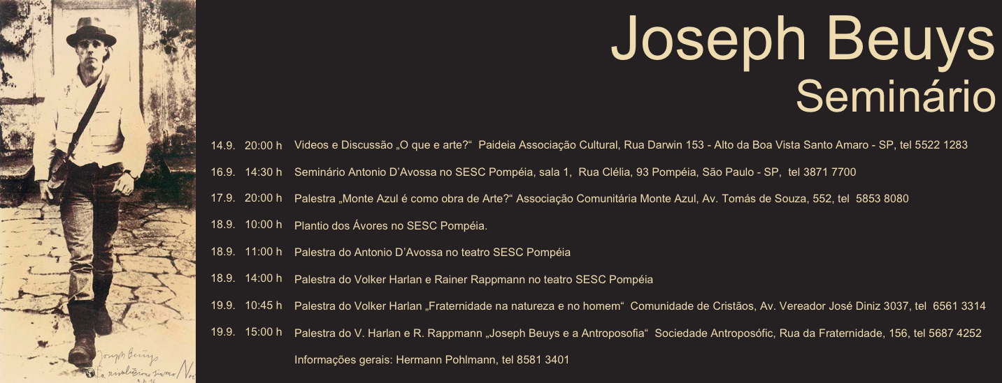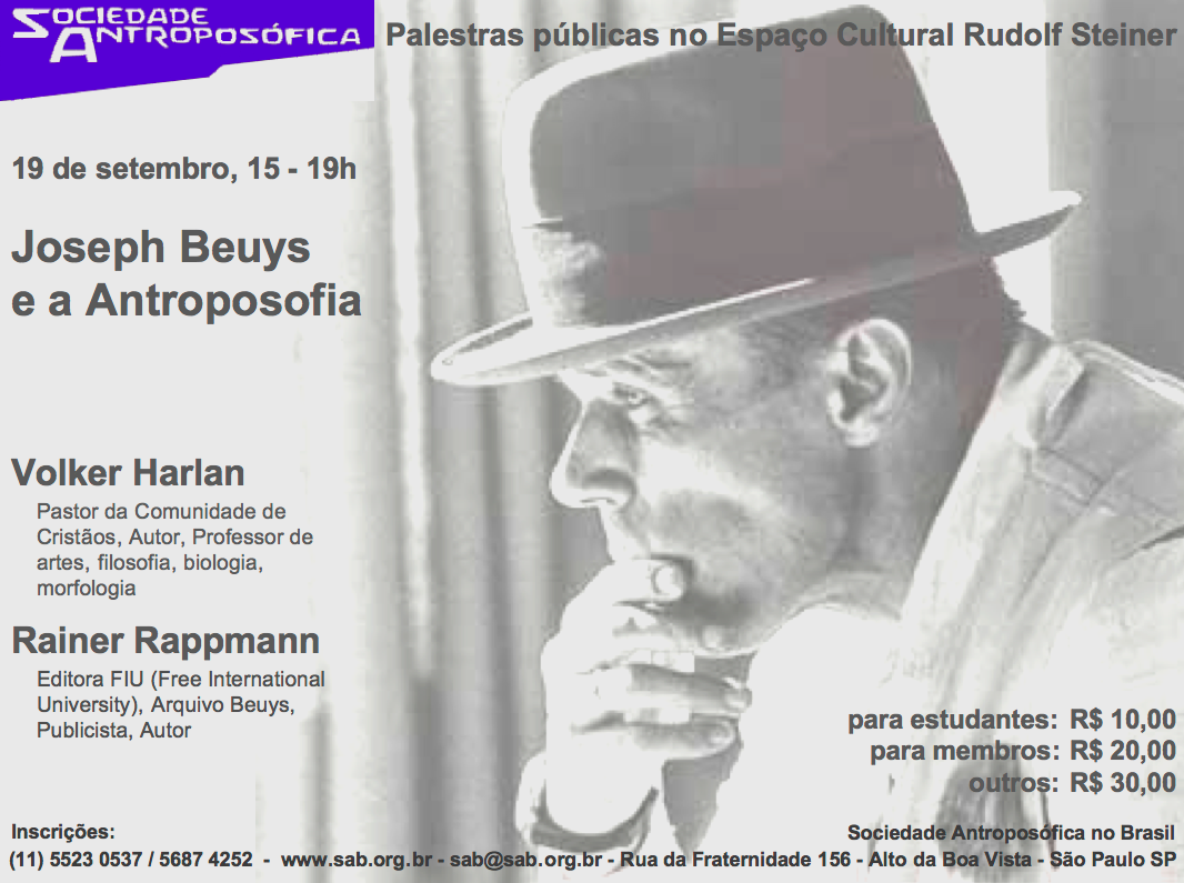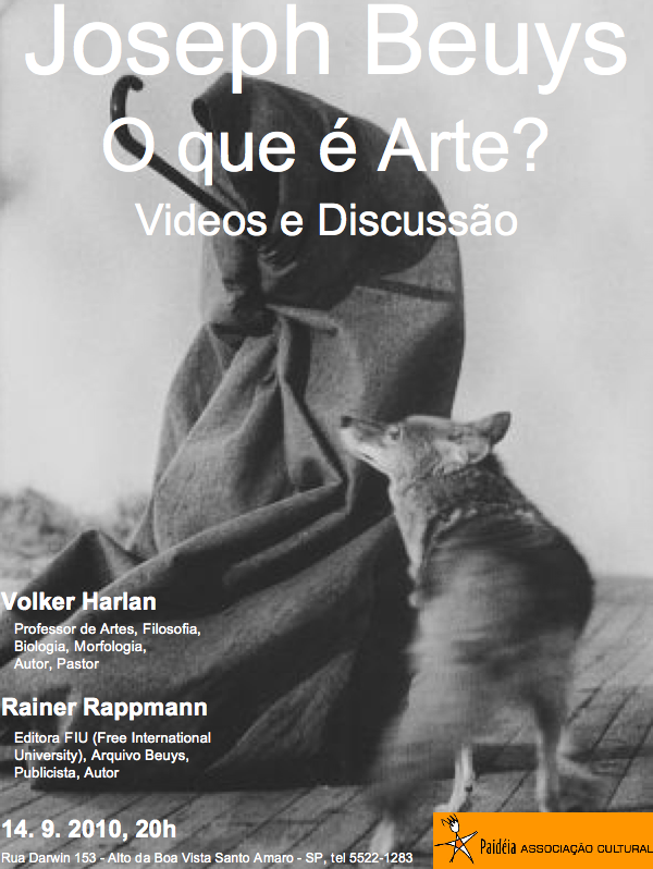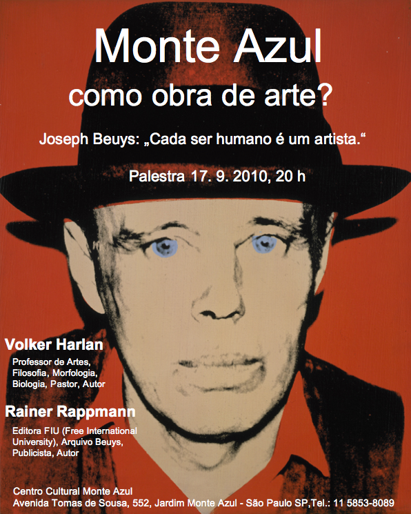 Im September kommen Volker Harlan und Rainer Rappmann, nach Sao Paulo und halten einige Vorträge und Seminare über Soziale Skulptur. Wir würden uns freuen, wenn ihr diese Informationen an Eure brasilianischen Freunde weitergeben könntet.