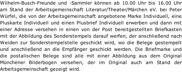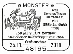 Der Wolbecker Peter Würfel, 1. Vorsitzender der Arbeitsgemeinschaft Literatur/Theater/Märchen e.V. und Mitglied des Briefmarkensammlervereins Münster ehrt mit seiner Arbeitsgemeinschaft mit dem von ihm entworfenen Sonderstempel anlässlich des Erscheinens des "Münchener Bilderbogens" Nro.465 im Jahre 1868 Wilhelm Busch im Rahmen des Großtauschtages des Briefmarkensammlervereins am 25. November 2018 in der Stadthalle Münster-Hiltrup. Es ist der 150. Geburtstag seiner Geschichte "Der Virtuos". Die Bildergeschichte erschien zum Jahreswechsel 1865/66 als abschließende Beilage zum 43. Band der "Fliegenden Blätter", einer humoristischen Wochenzeitschrift, die von 1845 bis 1928 im Verlag Braun & Schneider in München erschienen. Allgemeine Wertschätzung erfuhren die "Fliegenden Blätter" für ihre zielsichere, satirische Charakterisierung des deutschen Bürgertums.