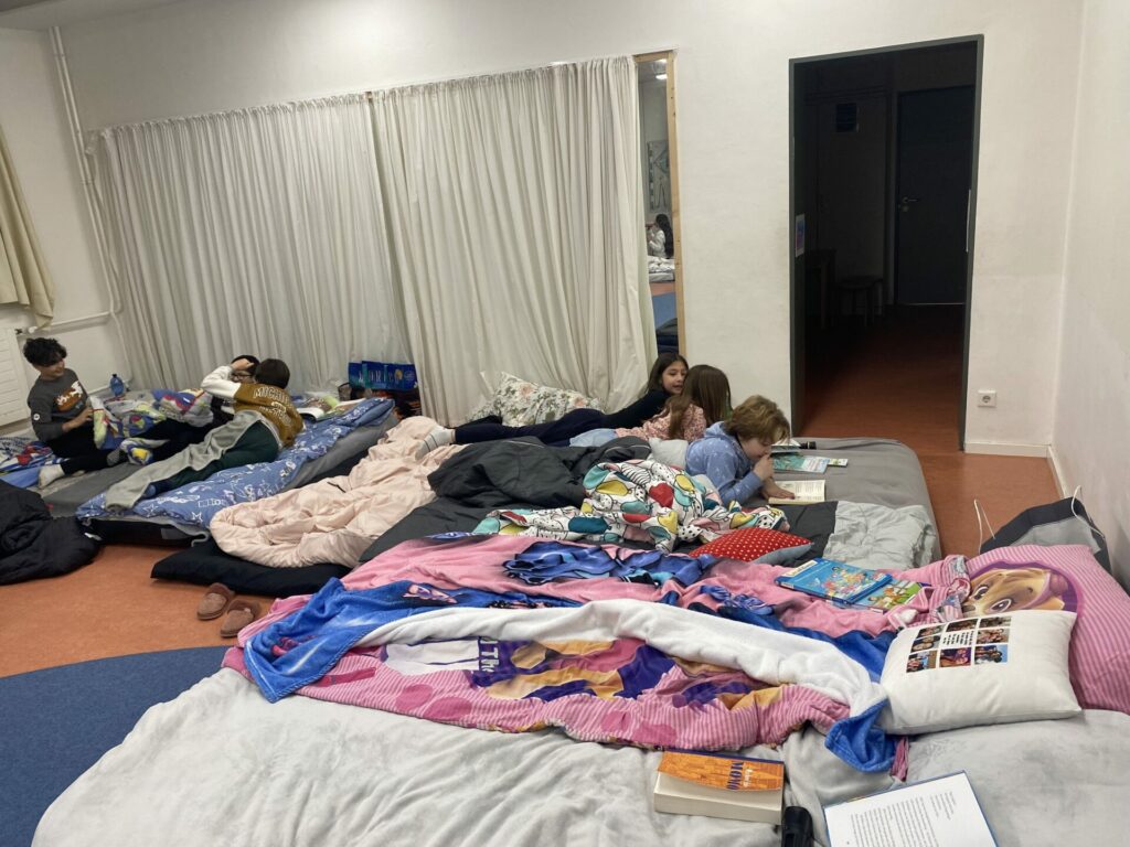 Gleich am Anfang durften die Kinder durch einen funkelnden Glitzervorhang das Souterrain betreten. Während im Musikraum ein großes, gemütliches Schlaflager aufgebaut wurde, backte die Pizza schon im Backofen. Danach wurde es spannend: Frau Zander hat die Geschichte „Der Mondscheindrache“ von Cornelia Funke vorgelesen. Die Kinder haben die Geschichte mit Orff-Instrumenten begleitet. Passend dazu wurden anschließend in der Forscherwerkstatt Mondscheindrachen-Glitzergläser gebastelt. Später kuschelten sich alle in ihre Schlafsäcke und Decken und lasen mit der Taschenlampe noch in Büchern – bis die Augen zufielen und langsam auch die letzten einschliefen. Am nächsten Morgen gab es -mit Unterstützung einiger Eltern- ein gemeinsames Frühstück. Müde, aber glücklich ging es dann nach Hause – mit vielen tollen Erinnerungen an eine wirklich zauberhafte Nacht.