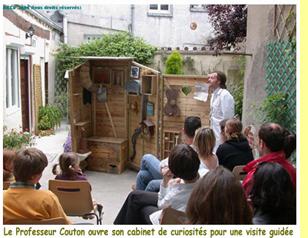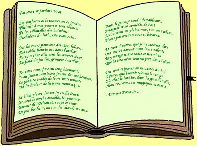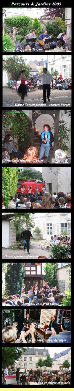 PARCOURS ... ET JARDINS Récemment s’est tenu le Festival Parcours ... et Jardins. Les points de suspensions sont là pour vous laisser le temps d’apprécier le jeu de mots ... et vous inviter à flâner dans nos rues pavées. « Parcours ... et Jardins », c’est un terrain d'essai pour jeunes pousses, comme dirait notre ami Mourad Guichard, journaliste à Libération, pour talents orléanais et autres à découvrir. Quatorze cours, jardins, terrasses ou maisons du quartier situé entre les rues de la Tour Neuve, de Bourgogne et avoisinantes, se sont ouverts à notre initiative pour recevoir des spectacles courts, variés, qui une diseuse de textes, qui une chorale de gospel, ici, de la danse contemporaine, là une exposition de peinture, du blues avec Rachel et le P’tit Crème et des chansons, encore et toujours des chansons avec Les Gâteaux sont dans l’assiette, car, en France, c’est bien connu, tous les repas finissent par un dessert et, de toute façon, tout finit par des chansons. Gâteaux, p’tit crème, mais aussi vins, bières, jus de fruits, croque-monsieur, omelette, restauration légère à la française, vous trouviez tout cela chez Jean-Mi et Sophie rue du Petit-Saint-Loup, cela et tous vos voisins, tous vos copains. Car c’était la fête ! Parcours et Jardins 2005, un franc succès, Guillaume Brabant, le peintre qui exposait, a vendu quatre tableaux. Quant à l’organisation, elle a été sollicitée par la Région pour exporter le concept dans d’autres villes. Je suis restée assise une heure et demie à l‘entrée de l’Hôtel Le Sauvage à distribuer de beaux prospectus verts qui partaient comme des petits pains. J’ai tenu deux jours de suite l’expo d’Alain Briand : Alain est connu à la DFG, il est revenu pour nous de Fréjus sur la Côte d’Azur, où il demeure maintenant, pour exposer ses « livres-objets ». Mon préféré fut Le Voyage, un gros volume couvert de gazon parcouru par un rail entouré de minuscules vaches : un clin d’oil, de l’humour, mais quel talent professionnel pour réaliser ces reliures fantaisistes ! J’ai fait la coursière pour porter les programmes chez Héléna, Patricia et Cécile, pour aller chercher une bouteille de Kir chez Jean-Mi ou des serviettes chez Bruno. Devant chez Jean-Mi, j’ai croisé l’homme à la BD qui m’a glissé dans le creux de l’oreille qu’il y allait avoir un crime rue du Petit Saint-Loup. Pas impossible, vu le monde qui déferlait sur les pavés ! J’ai accueilli le public chez Héléna et Jan, écouté « Les Gâteaux », particulièrement apprécié une de leurs compositions intitulées Ah ! Monsieur qui m’a rappelé des frasques de jeunesse, servi du Kir offert par ABCD et des gâteaux offerts par le groupe du même nom. Enfin, j’ai écouté Orléans Little Song, oh! happy day !, et invité ensuite tout le public à se rendre, pour le final, à la vente aux enchères humoristique et musicale sur la Place Saint-Aignan, où Cyril, à court d’objets, nous a proposé une enchère pour ... l’église elle-même, qui n’a pas trouvé acquéreur. Notre public ne serait-il donc pas bien pensant ? Tâcheronne, j’ai oeuvré là où je pouvais être utile et ne pourrai donc vous rendre compte des 32 spectacles ou animations, mais espère que vous prendrez plaisir à découvrir les programmation et photos sur le site.