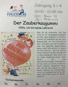 Am 21. November war der diesjährige BUNDESWEITE VORLESETAG – und wir waren wieder dabei! Durch die zahlreiche Unterstützung vorlesebegeisterter Eltern und Großeltern sowie des gesamten Kollegiums konnten zunächst die Erst- und Zweitklässler aus 19 verschiedenen Vorleseangeboten auswählen und dann ihrer Wunschgeschichte lauschen. Für die „Großen“ der 3. und 4. Klassen hatten wir in diesem Jahr zusätzlich Unterstützung durch engagierte Schüler der Lese-AG der benachbarten Erna-de-Vries-Realschule, sodass auch die Dritt- und Viertklässler aus einem breiten Angebot wählen konnten. Herzlichen Dank an alle, die diese kleine Auszeit auch in diesem Jahr möglich gemacht haben!
