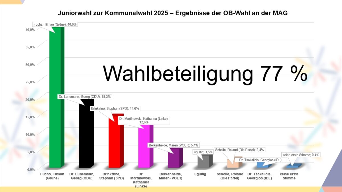 Trotz der 40% die Tilman Fuchs erreichte, käme es auch an der MAG zu einer Stichwahl zwischen ihm und Georg Lunemann, da die Kandidaten über 50% benötigen, um zu gewinnen.