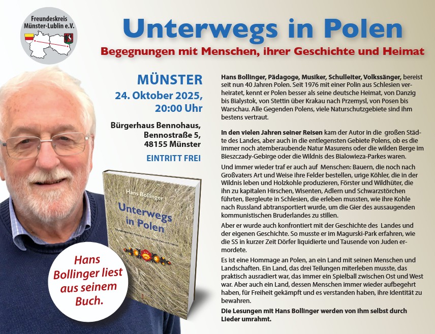 Im Mittelpunkt steht sein Werk „Unterwegs in Polen“ – ein sehr persönliches Buch, das mit feinem Humor und einfühlsamem Blick Einblicke in ein Nachbarland gewährt, das noch immer von Vorurteilen begleitet wird. Hans Bollinger berichtet von Begegnungen mit Bergleuten, Köhlern, Förstern, Lehrern und Bauern , Menschen, deren Geschichten jenseits medialer Schlagzeilen liegen, und die dennoch den Herzschlag Polens widerspiegeln.